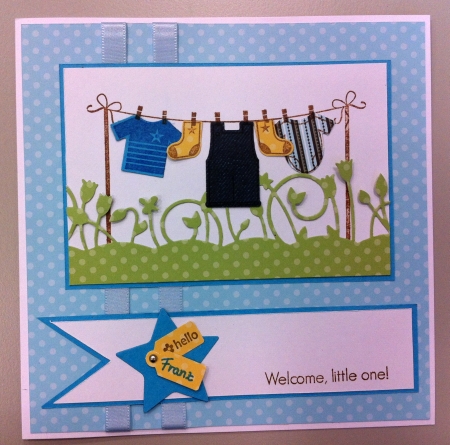 da ich schon lange nichts mehr gezeigt habe von mir, wollte ich euch heute mal eine Babykarte zeigen, die ich für den Sohnemann eines Kollegens gemacht habe. Dazu habe ich mein neues Papertrey-Ink Set benutzt, das ich zu knuffig finde...am meisten mag ich den kleinen Klammerstempel... :-)
